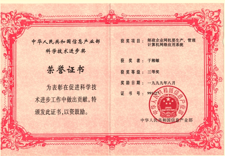 長沙市暉力計算機技術(shù)開發(fā)有限公司在全國郵政綜合計算機網(wǎng)建設(shè)期間,所開發(fā)的《郵政報刊發(fā)行系統(tǒng)》在北京代表中國郵政參加“世界先進通信技術(shù)博覽會?!边M入綜合計算機網(wǎng)建設(shè)專家組,參與修改總體方案,參與對多個業(yè)務(wù)系統(tǒng)的方案制定,參加項目評審驗收,發(fā)揮了積極的作用。獲得兩項國家科技進步三等獎。